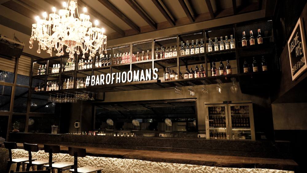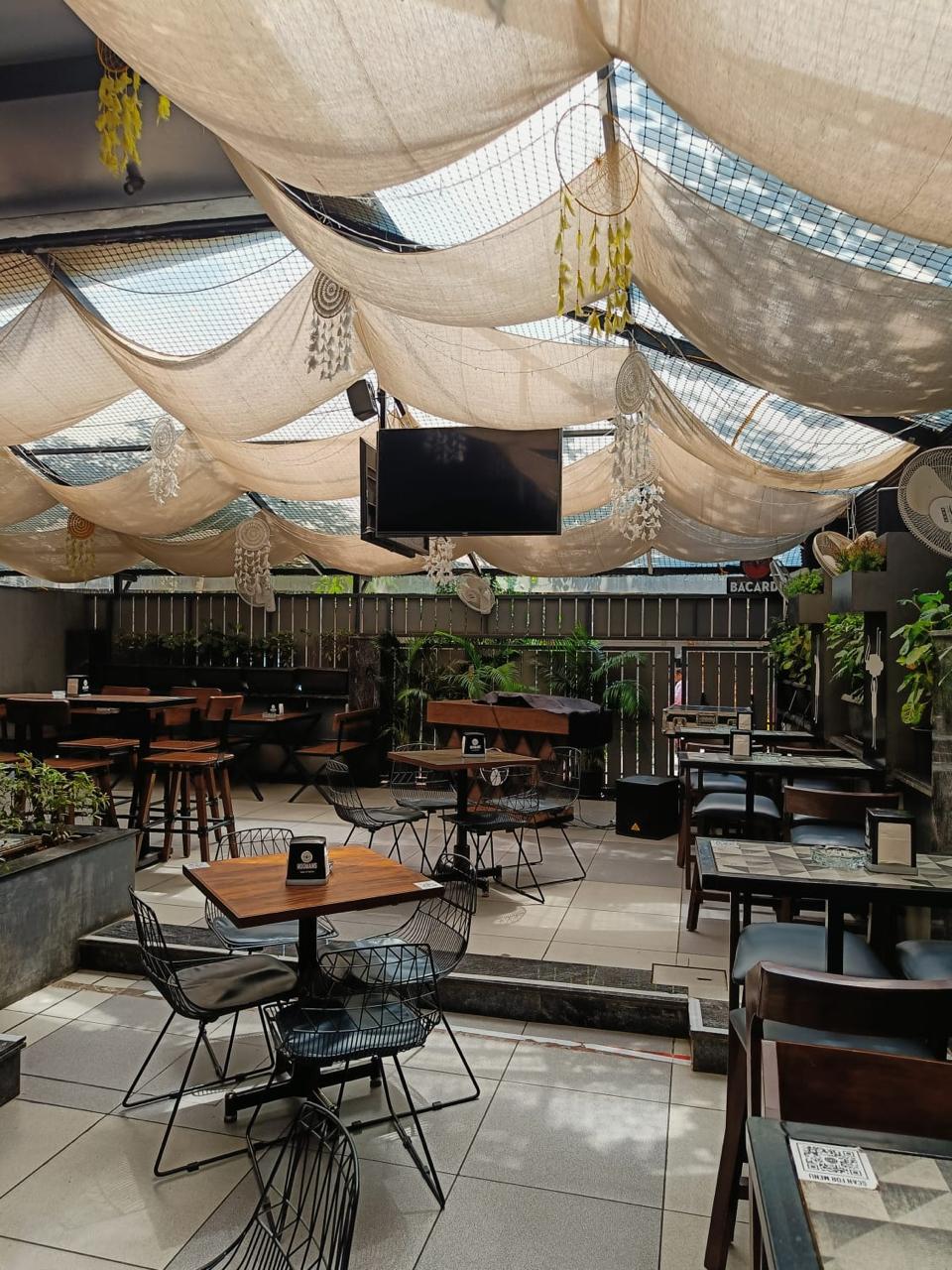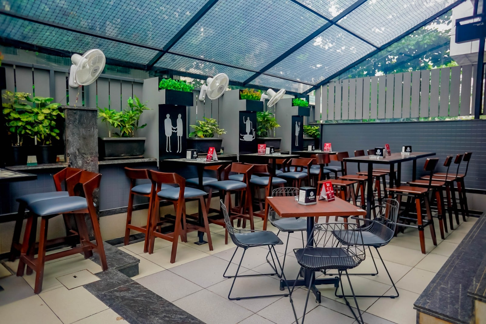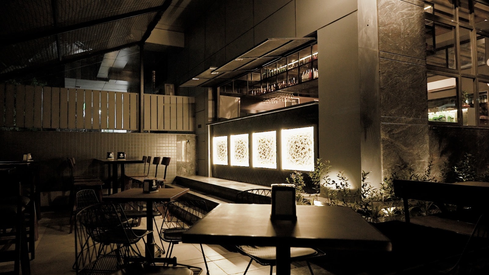 The centerpiece? A seamless bar that connects the inviting interior with the captivating outdoor space, where lush greenery complements a striking monochrome aesthetic.