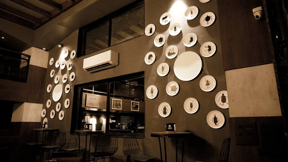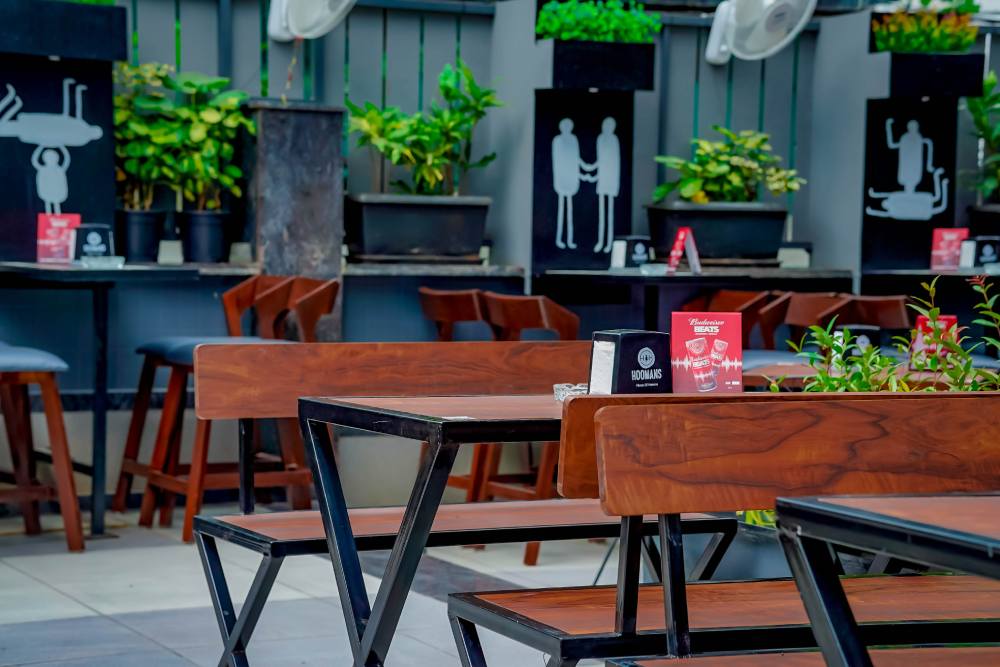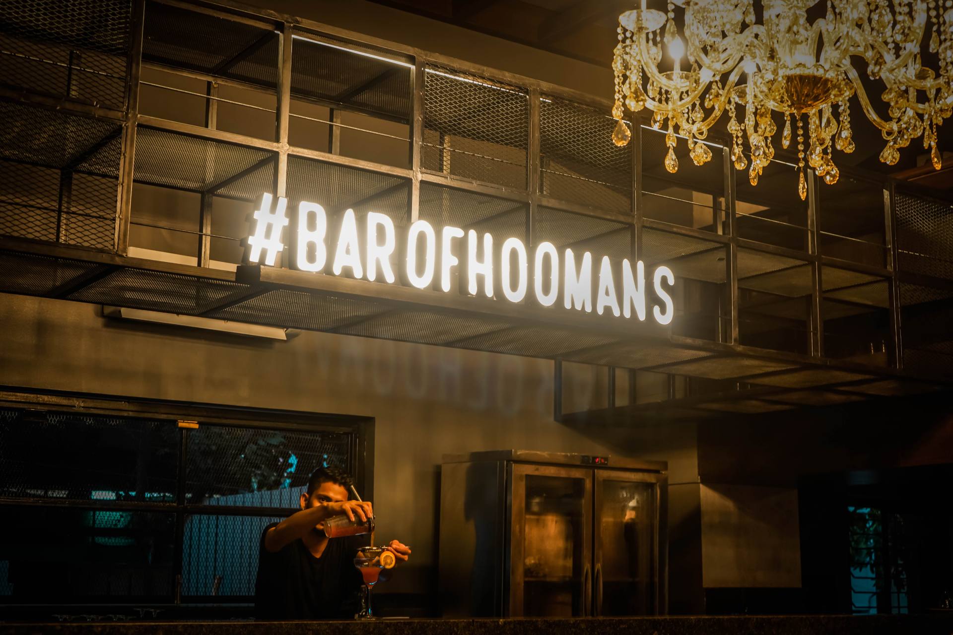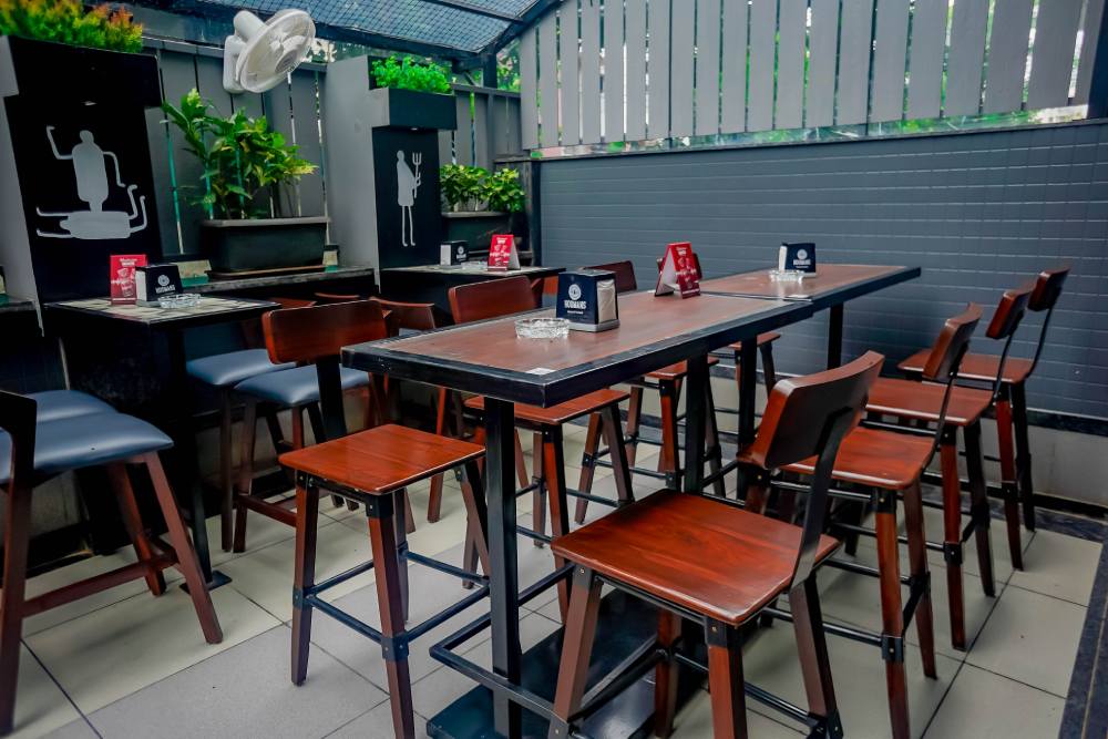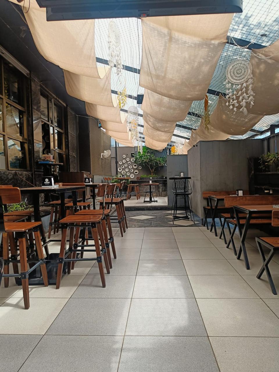 The centerpiece? A seamless bar that connects the inviting interior with the captivating outdoor space, where lush greenery complements a striking monochrome aesthetic.