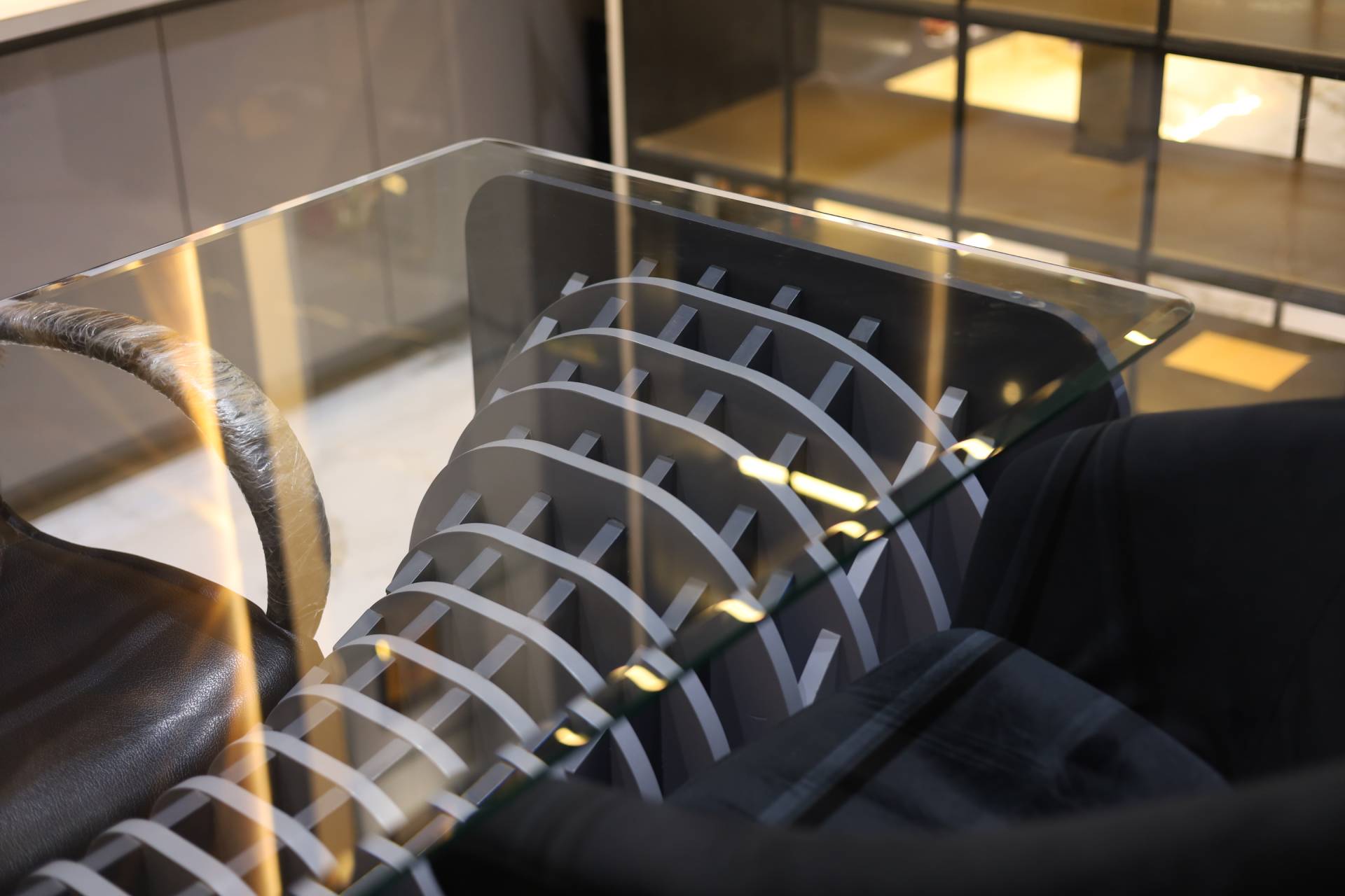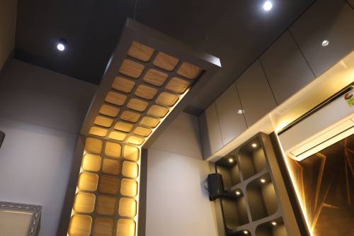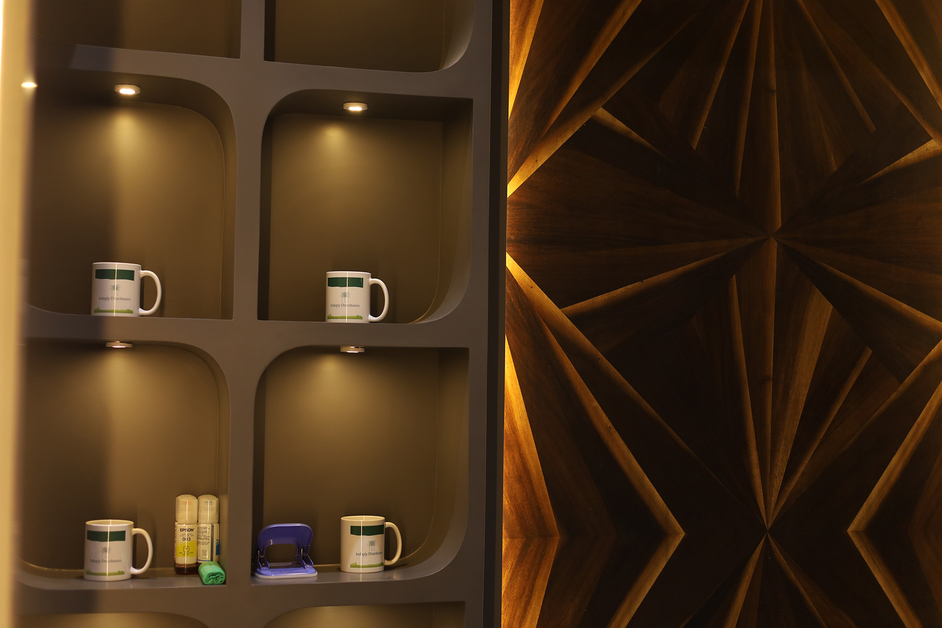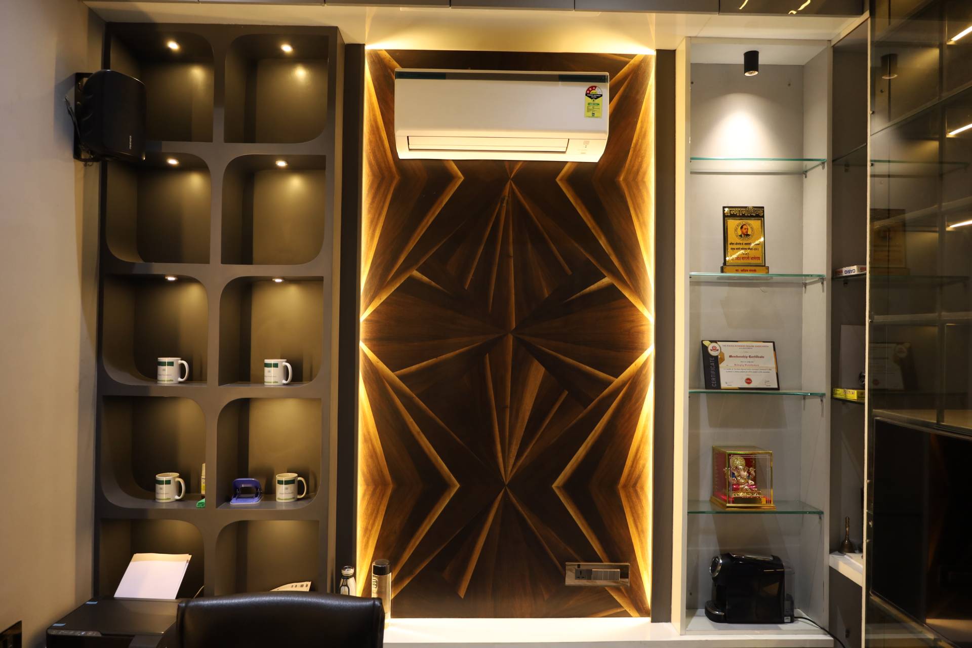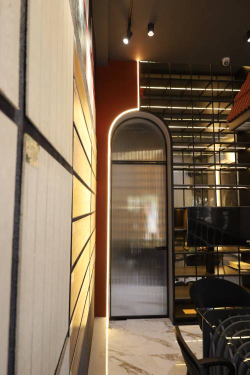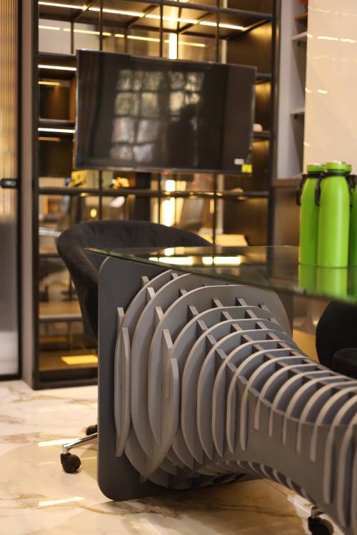 Experience a transformative workspace where project displays and functional design converge seamlessly. This showroom-meets-office space embodies refined luxury, showcasing meticulously selected materials alongside captivating parametric elements.